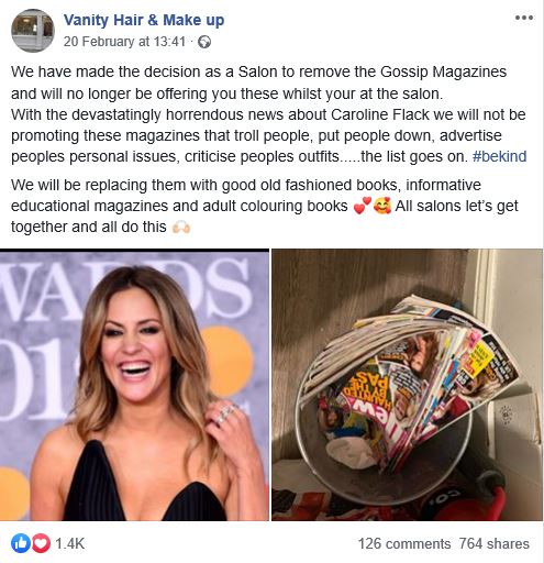 Vanity Hair & Makeup in Durham shared their decision to remove all gossip magazines from their salon via Facebook.